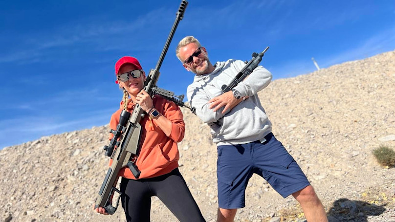 Embark on a thrilling desert shooting tour with three powerful guns, guided by professionals, as you fire a pistol and two fully automatic machine guns in a stunning Nevada desert setting