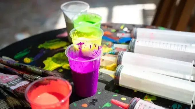 - Paints, syringes, brushes, and art supplies