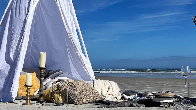 Enjoy a luxurious beach picnic with a plush teepee setup, gourmet charcuterie, and stunning ocean views, perfect for a memorable evening